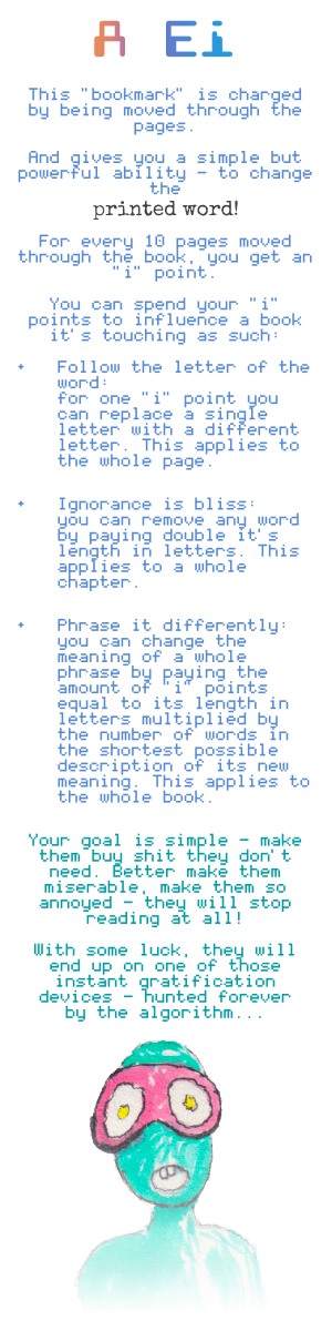 This is not a simple bookmark but an "A Ei" (pronounced (h)Ey Eye) device, a genius piece of tech, able to retrofit old, boring books with the capabilities of personalized, targeted advertisement.