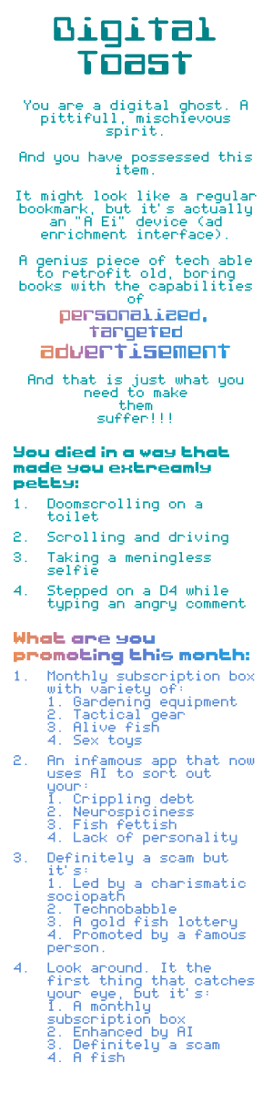 You are a petty ghost trapped in it with only one goal: to make a poor reader who mistakenly picked up this bookmark absolutely miserable by ruining their book.