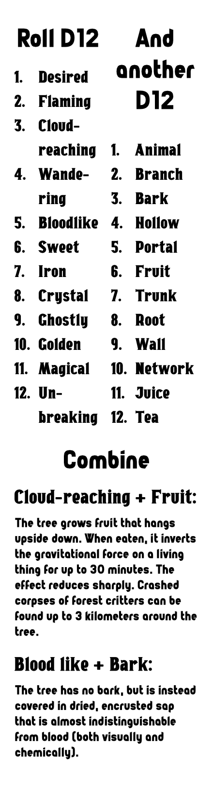 This is a spark table on a bookmark that lets you generate an odd tree to place in your game. I have created this for the TTRPG Bookmark Jam.